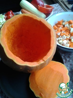 Подготавливаем наш "горшочек". Срезаем с тыквы крышечку, и аккуратно извлекаем серцевину. Семечки нам не нужны, а срезанную мякоть нарезаем кубиками. С донышка стараемся сильно не срезать, чтобы в процессе приготовления оно не протекло. Со стенок стараемся снять побольше.