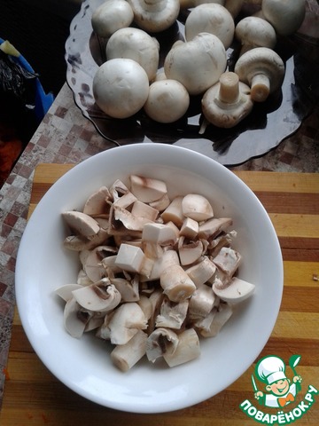 Шампиньоны не мельчим. Хотя конечно все зависит от их размера.