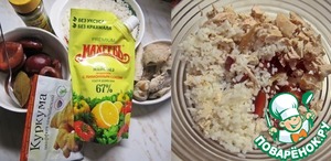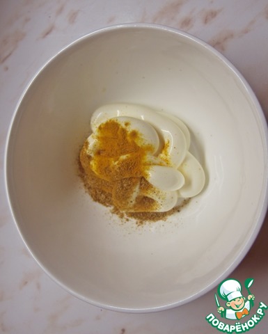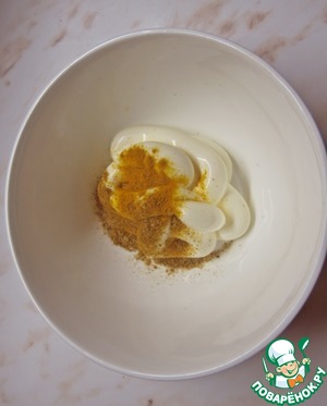 К майонезу добавить карри и куркуму, перемешать и заправить салат. Украсить маринованной сливой и петрушкой.