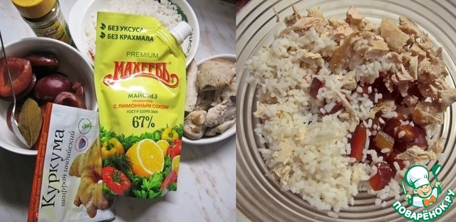 Подготовить отварную индейку, отварной рис. Нарезать индейку и сливу, добавить рис.