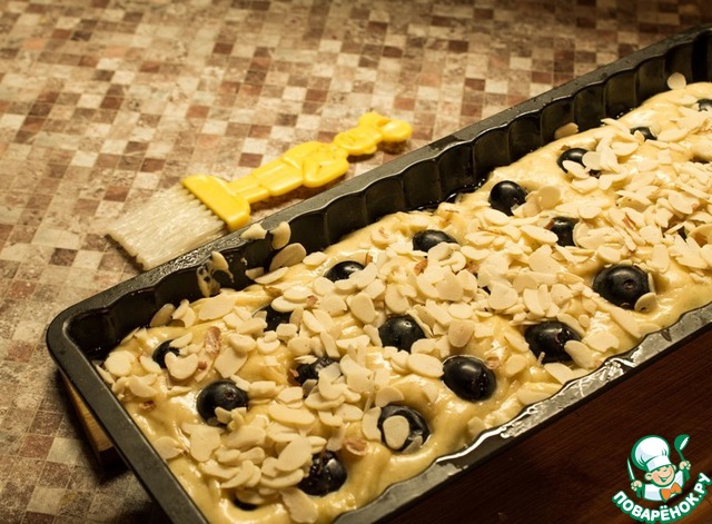 Форму смазать маслом, выложить тесто, добавить виноград, утапливая его в поверхность теста. Посыпать миндальными лепестками.