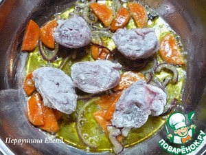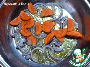 На дно посуды для жарки выложить кольца лука и ломтики моркови.