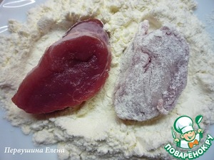 Обвалять мясо в муке, отряхнув лишнюю. Должна быть лишь легкая мучная «глазурь».