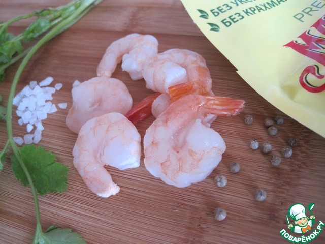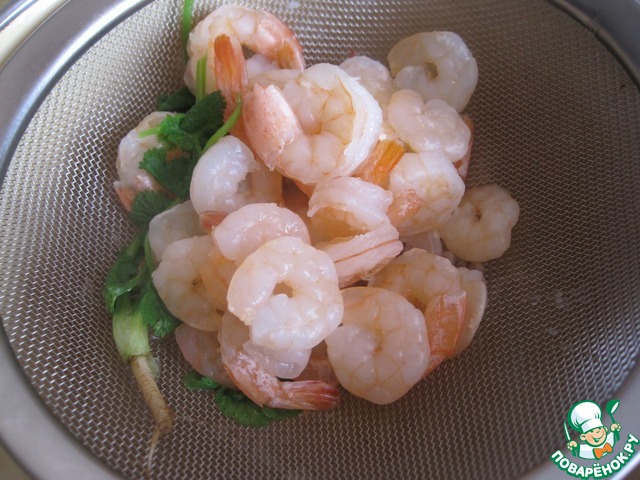 Креветки заливаем холодной водой, добавляем соль ( у меня крупная морская), белый перец горошком и веточку петрушки. Даём креветкам закипеть, снимаем с огня.