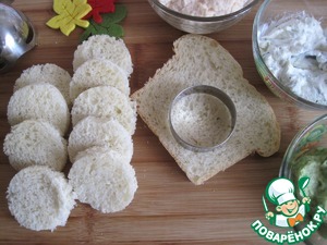 На один сэндвич нам понадобится два кружка с творожным сыром, один кружок с креветочным муссом, один кружок со сливочным маслом и икрой.