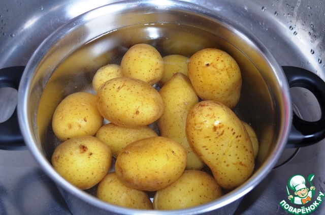Картофель хорошо помыть, отварить, слить воду. Залить холодной водой, так легче снимется потом кожура с картофеля, дать немного постоять.