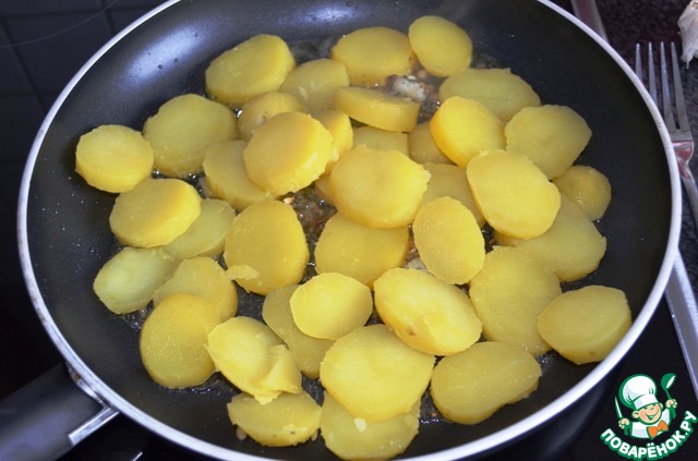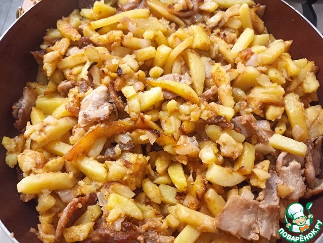 Картофеля не должно быть много (не больше 2 порций), иначе получится не так! Если картофеля много, лучше жарить в двух сковородах!