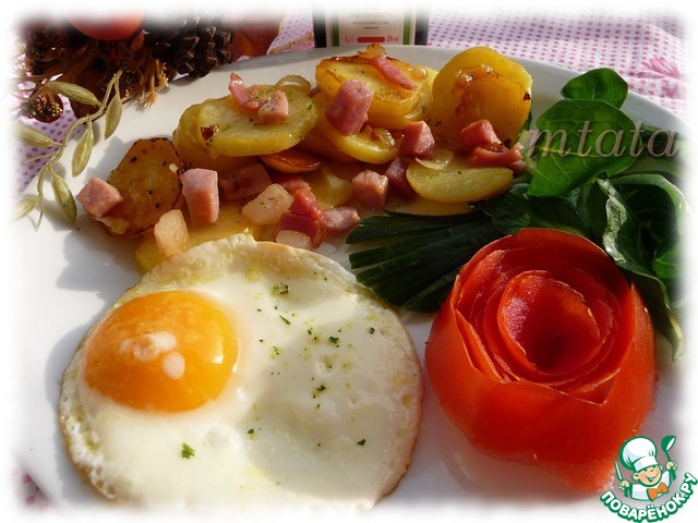Картофель выложить на тарелку. В этой же сковороде пожарить яйцо.
