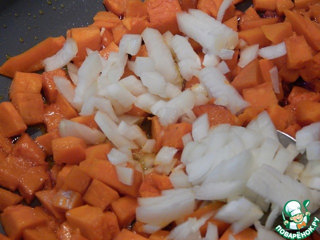 В сковороде разогреть масло и выложить нарезанную кубиками тыкву.
