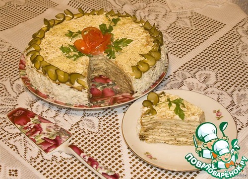Бока торта обсыпаем натертым вареным яичным белком, а на поверхность блина натираем яичный желток. Наносим сеточку из майонеза и украшаем овощами и веточками зеленой петрушки.