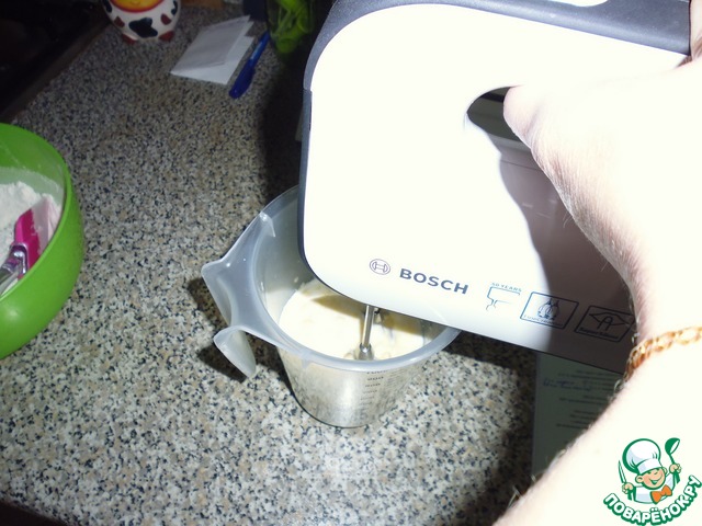 Отдельно взбиваем кефир комнатной температуры и 2 с. л. растопленного сливочного масла.