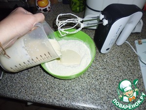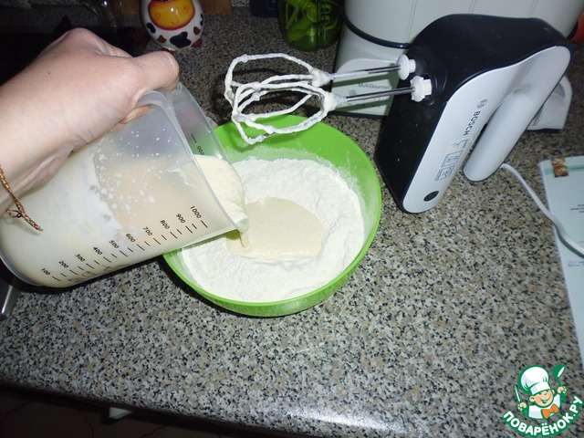 Затем, кефирную смесь вливаем в муку и перемешиваем до однородного состояния.