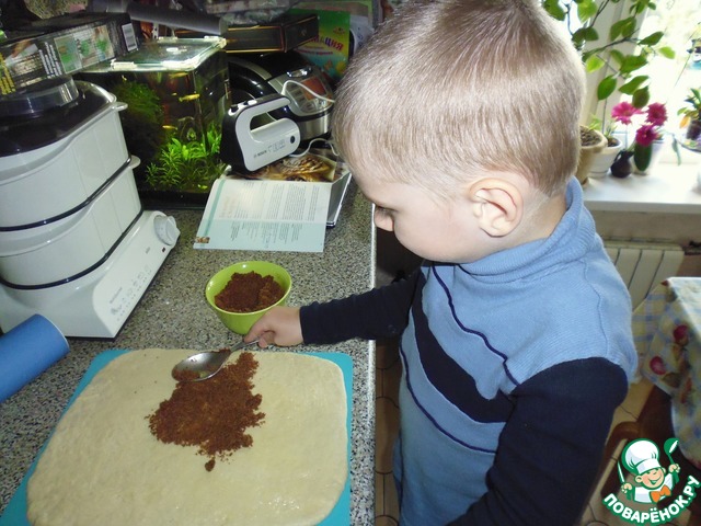 Посыпаем начинкой (это делал у меня самый главный помощник на кухне) и,