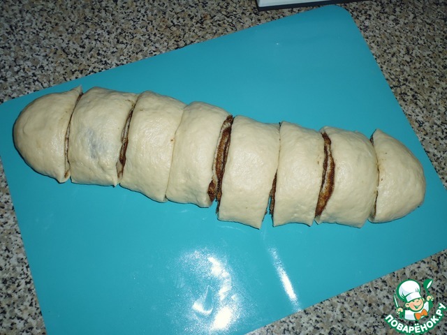 Теперь аккуратно сворачиваем тесто рулетом. Я сворачивала с короткой стороны, так как при скручивании тесто все равно немного расползается и выходит длинный рулетик. Не забудем защипнуть края и шов рулета, чтоб скрыть начинку.