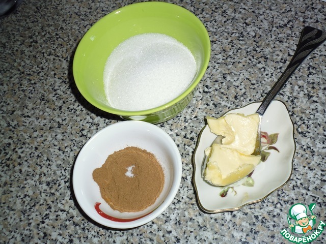 Подготовим начинку, для этого смешаем сахар (за неимением в наличии коричневого, я использовала 175 гр. обычного сахара) с солью и корицей, затем добавим растопленное сливочное масло и все тщательно перемешаем. Получившаяся масса должна напоминать влажноватый мелкий песок.