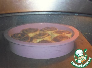 Готовые булочки оставьте ненадолго в форме, чтоб остыли чуть (чего мы и не смогли сделать, запах корицы просто сшибает носы).