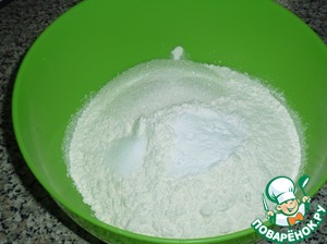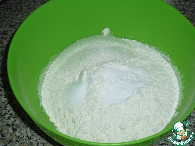 В средней миске смешать муку, сахар, соль, разрыхлитель и соду (я вместо разрыхлителя использовала 1 ч. л. соды + 0,5 ч. л. лимонной кислоты, дополнительно соду не добавляла).
