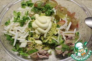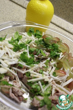 Нарезать мякоть курицы на небольшие ломтики, сельдерей - соломкой, виноград - четвертинками, зелень петрушки мелко порубить.