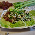Выложить салат горкой на салатные листья, украсить, просыпав салат луком, тонкими полосками майонеза и ягодами винограда.