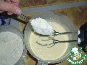 Постепенно вводим муку, смешанную с пряностями и разрыхлителем. Вымешиваем до однородности.
