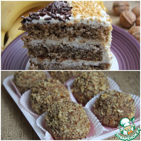 С ананасов слить сок и дать им хорошенько обсохнуть. Бананы порезать кусочками, не мелко, примерно такими же как ананасы. Затем, смешиваем орехи, ананасы, бананы и добавляем 50 гр. муки. -