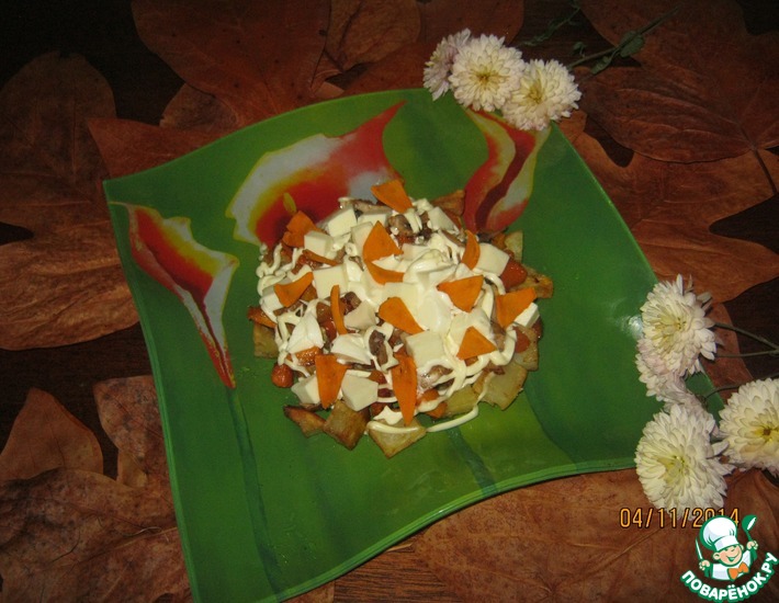 И завершающий шаг. Немного майонеза и кубики моцареллы.
