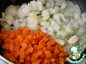 На растительном масле обжарить лук, морковь и чеснок, разрезанный вдоль пополам.