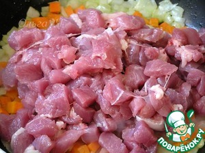 • Добавить мелко нарезанное филе, обжарить, помешивая, до изменения цвета.