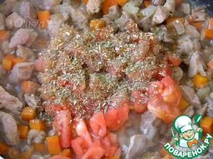 Влить вино, дать выпариться спирту, затем добавить мелко нарезанный помидор, орегано, соль и перец, перемешать, влить бульон, готовить под крышкой около 10 минут.