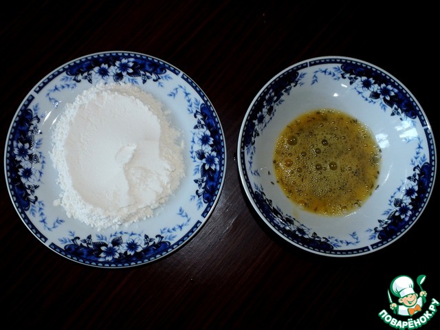 Тем временем подготавливаю муку, и в отдельной миске смешиваю яйцо с солью и тимьяном. Кусочки курицы выкладываю сначала в яйцо, затем обваливаю в муке