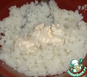 Рис отварить в подсоленной воде до готовности. Добавляем сметану и перемешиваем.