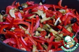 4. Сладкий перец порезать полосками, огурцы соломкой. Если у вас маринованные корнишоны, то можно просто порезать их пополам или на 4 части, в зависимости от размера. Маслины порезать колечками. В сотейнике перемешать овощи, томатное пюре, копченую паприку, влить бульон и сливки, довести почти до кипения, убавить огонь и тушить 5 минут на среднем огне под крышкой.