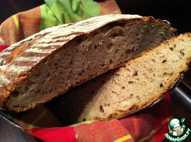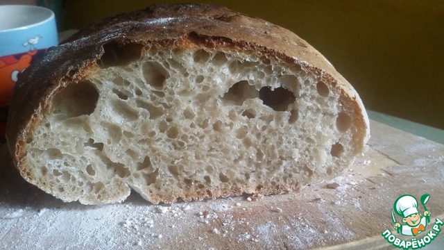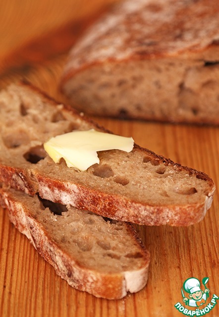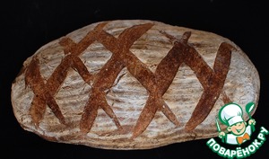 Очень аккуратно переверните хлеб на лист для выпечки, сделайте надрезы. Выпекайте на предварительно хорошо разогретом камне при температуре 230 °C 40-50 минут. Для пара в первую минуту выпечки можно побрызгать в духовку из пульверизатора.