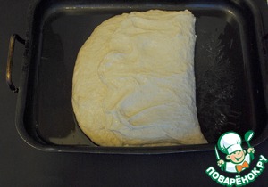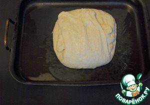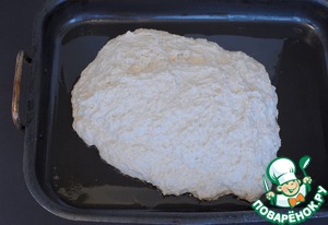 Выкладываем тесто в глубокий противень, смазанный растительным маслом и закрываем пленкой и оставляем для ферментации на 3 часа при комнатной температуре.