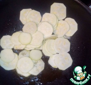 Моем, очищаем от кожуры кабачок, нарезаем его тонкими кружками