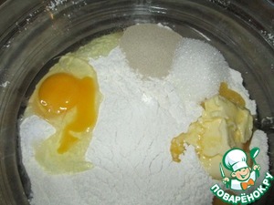 В миске смешать просеянную муку, яйцо, дрожжи, размягченное сливочное масло, соль и сахар