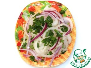 Репчатый и зелёный лук режем тонкими кольцами или полукольцами. На сковороде разогреть подсолнечное масло. Выложить лук и обжарить до золотистого цвета.