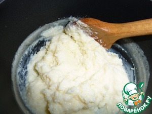 Варим манную кашу. В молоко всыпать манную крупу, сахар, соль, довести до кипения, проварить 1-2 сек. и убрать с огня, остудить.