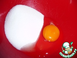 Сахар смешать с ванильным сахаром, добавить яйцо и все взбить.