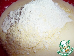В яичную массу влить растительное масло, кефир, взбить, добавить манную кашу, взбить.