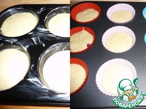 Формы для кексов смазать сливочным маслом, силиконовые не смазывать. Выкладываем тесто в формочки на ¾.