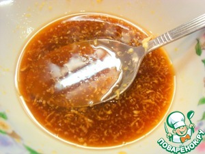 Смешать в миске соевый соус, апельсиновый сок, цедру, тертый имбирь, уксус, перчик чили и мед.