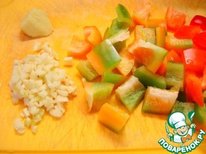 Нарезать перец крупными кусочками, чеснок измельчить, имбирь почистить.