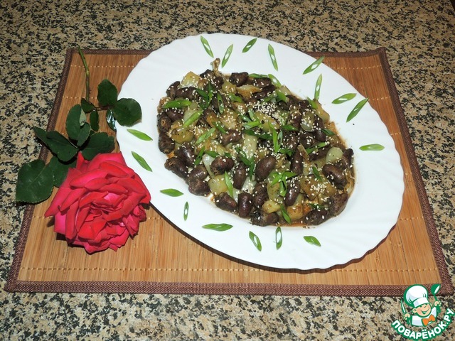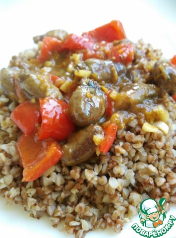 В китайском стиле! В принципе, вы можете вместо сердечек взять куриное филе, а на гарнир смело использовать рис. Но, если честно, то мне уже поднадоело филе, и я так захотела гречку! Одним словом, сердечки по-восточному сегодня отдали свое сердце русской гречке ;) Нежные сердечки, сладкий перец, и все это покрыто ароматным, пикантным соусом. Получилось замечательно вкусно! Если честно, то приготовила немного и очень-очень об этом пожалела! Завтра повторю, благо готовить-то быстро и просто!
