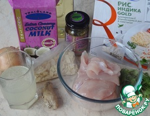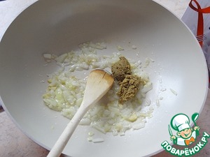 Разогрейте растительное масло в глубокой сковороде. Жарьте лук с имбирем до мягкости. Вмешайте пасту карри (у меня зелёная) и готовьте на слабом огне минутку. Следите, чтоб не пригорело.