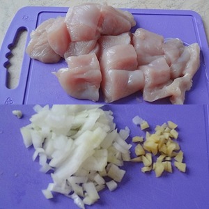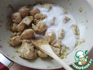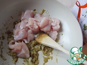 Положите в сковороду ломтики курицы, перемешав их с пряным луком. Готовьте, пока ломтики не побелеют.