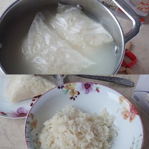 Тем временем приготовился рис. Достаньте пакетики, вскройте их, высыпьте рис на тарелку.