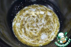 Молоко, соль, травы, разрыхлитель теста, оливковое масло и молотый мускатный орех, смешать в чашке. Добавить 150 г. муки, размешать хорошо.