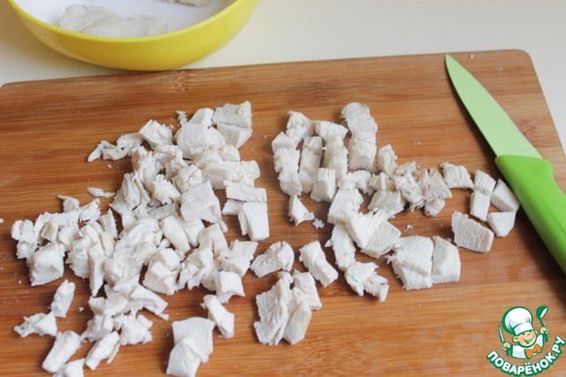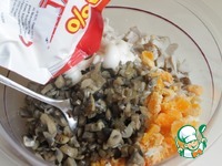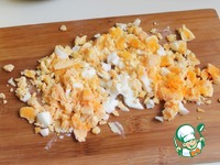 Смешаем теперь грибы, мясо курицы, желтки. Посолим слегка. (У меня дома были крабовые палочки, я их тоже нарезала мелко, но это не обязательно)