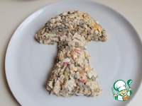 Берем большое блюдо и выкладываем салат в виде гриба. Можно нарисовать сначала майонезом контур.